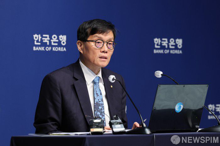 [서울=뉴스핌] 사진공동취재단 = 이창용 한국은행 총재가 17일 서울 중구 한국은행 본관에서 열린 금융통화위원회 본회의를 마친 후 통화정책방향 기자 간담회를 열고 취재진의 질문에 답하고 있다. 2025.04.17 photo@newspim.com