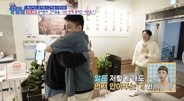 은지원은 고지용을 만나자마자 꼭 안아주며 반가워했다. 그는 "엄마에게 고지용 영상을 보여줬다. '지용이가 왜 이렇게 말랐냐'고 했다"고 말했다.