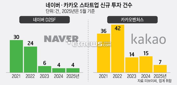 25일 벤처투자정보업체 더 브이씨(The VC)와 업계에 따르면, 네이버 D2SF와 카카오벤처스는 올해 들어 각각 4건과 7건의 스타트업 투자를 진행했다. 네이버 D2SF는 이미 지난해(4건)와 같은 건수의 신규 투자를 단행했다. 카카오벤처스는 지난해 신규 투자(15건)와 비슷한 추이지만, 후속 투자까지 포함하면 총 10건에 이르는 투자를 5월까지 집행했다.