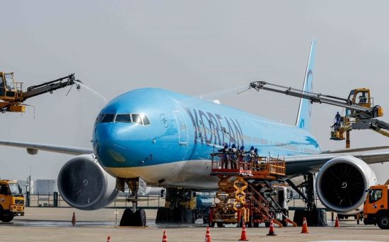 24일 인천 중구 대한항공 항공기 정비고에서 대한항공 관계자들이 새로운 CI가 적용된 항공기 동체를 세척하고 있다. 2025.4.24. 강진형 기자