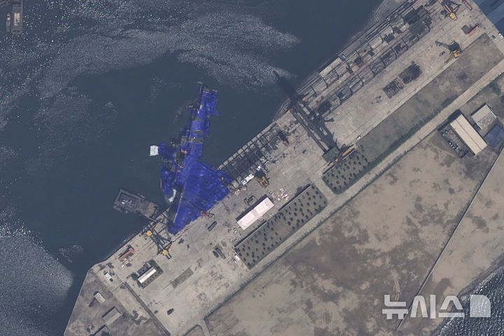 [청진=AP/뉴시스] 에어버스 DS가 제공한 22일 자 위성 사진에 북한 청진의 조선소에서 진수에 실패한 5000t 최현급 신형 구축함이 파란 방수포에 덮여 있다. 2025.05.25.