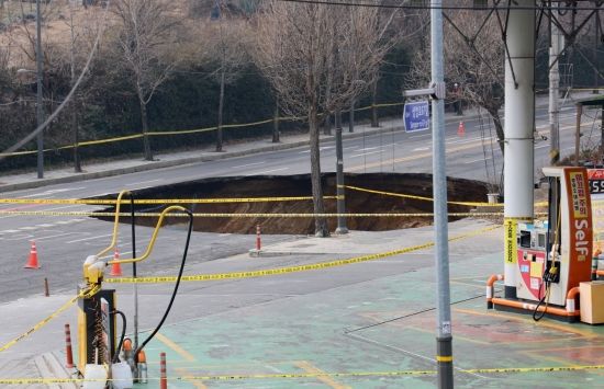 지난 24일 서울 강동구 대명초등학교 인근 사거리에서 4개차로에 걸친 '대형 싱크홀(땅꺼짐)' 이 발생했다. 25일 사고 현장 주변이 통제되고 있다. 싱크홀에는 승용차 1대와 오토바이 1대가 빠졌으며, 승용차 탑승자 1명은 인근 병원으로 이송됐다. 현재 싱크홀 아래에는 오토바이 운전자 1명이 매몰돼 있다. 깊이는 30m로 추정된다. 2025. 03. 25 윤동주 기자 |