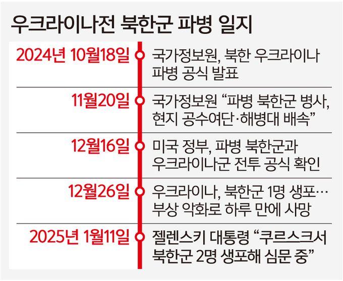 우크라이나 전쟁에서 북한군 포로의 존재가 알려진 것은 지난 1월이다. 볼로디미르 젤렌스키 우크라이나 대통령이 1월 11일(현지시간) 러시아 쿠르스크 전선에서 생포한 북한군 병사 2명을 공개했다. 그다음 날 이들과 우크라이나 병사를 교환하자는 제안도 내놓았다.