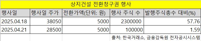 ‘이재명 테마주’로 분류되는 상지건설은 지난달 두 차례에 걸쳐 전환청구권행사 사실을 공시했다. 총 120억 규모로, 전체 발행주식의 60%에 달하는 240만 주가 이달 22일 신규상장됐다. 전환청구권이 행사된 이틀간 상지건설의 주가 평균이 3만5200원이고, 전환가액이 5000원이라는 점을 고려하면 투자자가 차익을 실현하기 위해 전환에 나선 것으로 풀이된다.