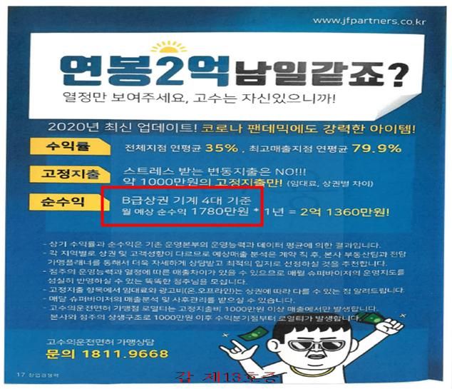 공정위에 따르면 제이에프파트너스는 2021년 12월과 2022년 4월 가맹희망자를 모집하면서 허위·과장된 창업안내서를 제공했다. 실제로는 B급 상권, 기계 4대 기준 실제 월평균 순수익이 1000만원 수준(2020년 기준)임에도 월 예상 순수익을 '1780만원'으로 표기한 것이다.