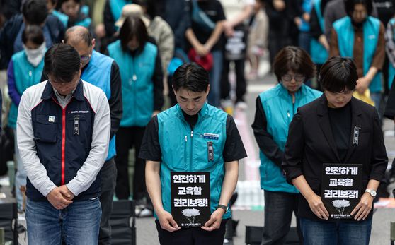 지난 24일 서울 종로구 경복궁 영추문 인근에서 열린 전국교직원노동조합(전교조) 창립 36주년 전국교사결의대회에 참가자들이 제주의 한 중학교에서 숨진 40대 교사 A씨를 추모하고 있다. 뉴스1