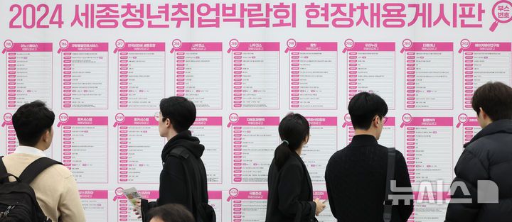 [세종=뉴시스] 강종민 기자 = 지난해 11월 12일 세종시 어진동 정부세종컨벤션센터에서 열린 2024 세종청년 취업박람회에서 구직자가 현장채용 게시판 앞에서 일자리를 찾고 있다. 2024.11.12. ppkjm@newsis.com