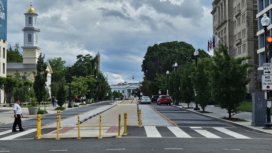 경찰의 과잉 진압으로 사망한 조지 플로이드의 5주기(5월 25일)를 앞둔 24일(현지시간) 워싱턴 백악관 북쪽 16번가에 집회를 차단하기 위한 차단봉이 설치돼 있다. 플로이드 사건 이후 이곳은 '흑인의 생명도 소중하다 광장'으로 명명됐지만, 트럼프 대통령이 취임한 이후 관련 시설을 모두 철거하고, 이름도 '자유 광장'으로 변경했다. 강태화 특파원