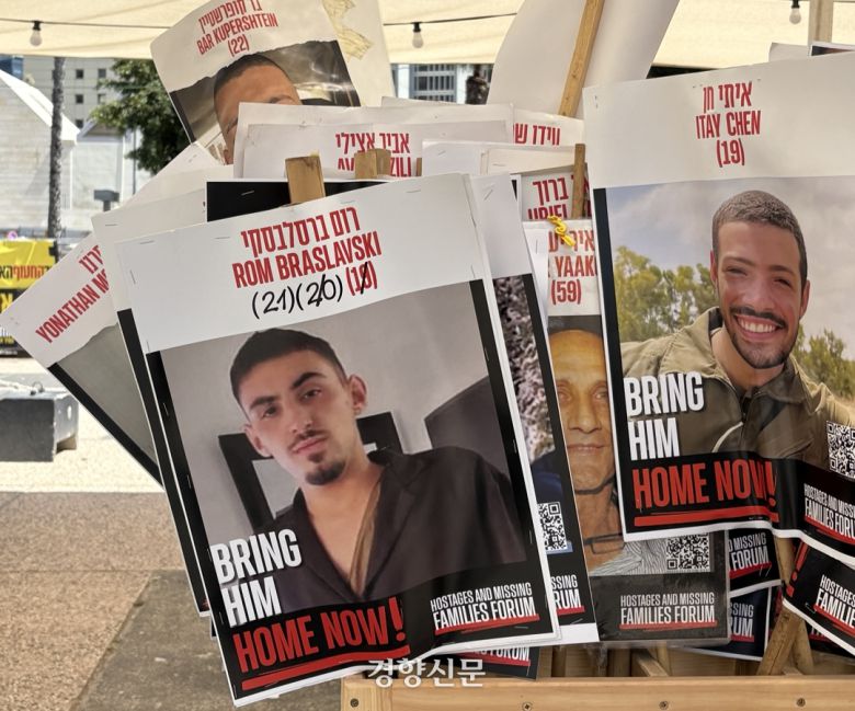 이스라엘 당국은 현재 가자지구에 약 58명이 인질로 잡혀 있으며, 이 중 약 21명이 생존한 것으로 추정한다. 이날 텔아비브 미술관 앞 인질 광장에는 풀려나지 못한 인질 58명의 사진과 함께 이들의 무사 귀환을 바라는 노란 리본과 깃발이 매달려 있었다. 큰 전광판엔 인질들이 가족 품으로 돌아오지 못한 시간이 ‘593(일):09(시):28(분):47(초)’를 지나고 있었다. 그사이 한 인질의 사진에 적힌 나이는 처음 19세에서 20세, 21세로 두 번 고쳐졌다.