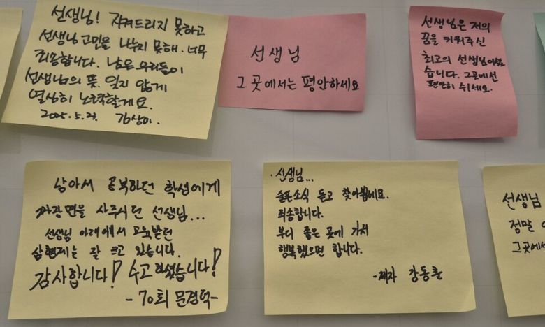 분향소 안에는 교사에게 미안함과 고마움을 전하는 제자와 동료 교사들의 메모가 빼곡하게 붙어 있다. 서보미 기자 |