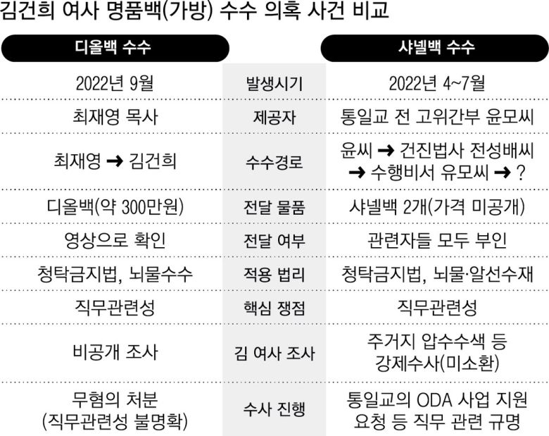 두 사건은 김 여사에게 고가의 명품 가방이 전달됐다는 점에서 유사하다. 300만원 상당의 디올백은 2022년 9월 최재영 목사가 직접 건넸고, 서울의소리가 2023년 11월 이 장면을 영상으로 공개했다. 샤넬백 2개 등은 통일교 전 고위간부 윤모씨가 무속인 전성배씨를 거쳐 김 여사 측에 전달한 것으로 검찰은본다. 다만 샤넬백이 김 여사 수행비서 유모씨에게 전달된 사실까지만 확인됐다. 김 여사 본인에게 전달됐는지는 아직 불분명하다.