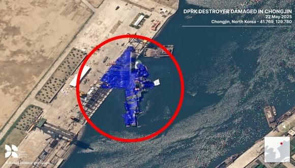 영국의 비영리 안보연구기관 오픈소스센터(OSC)가 22일(현지시간) X를 통해 진수식에서 파손된 북한 신형 5000t급 구축함 사진을 공개했다. 함수는 육지에, 함미는 물에 있는 채로 파란색 거적이 둘러져있는 것으로 보인다. 엑스 캡쳐. |
