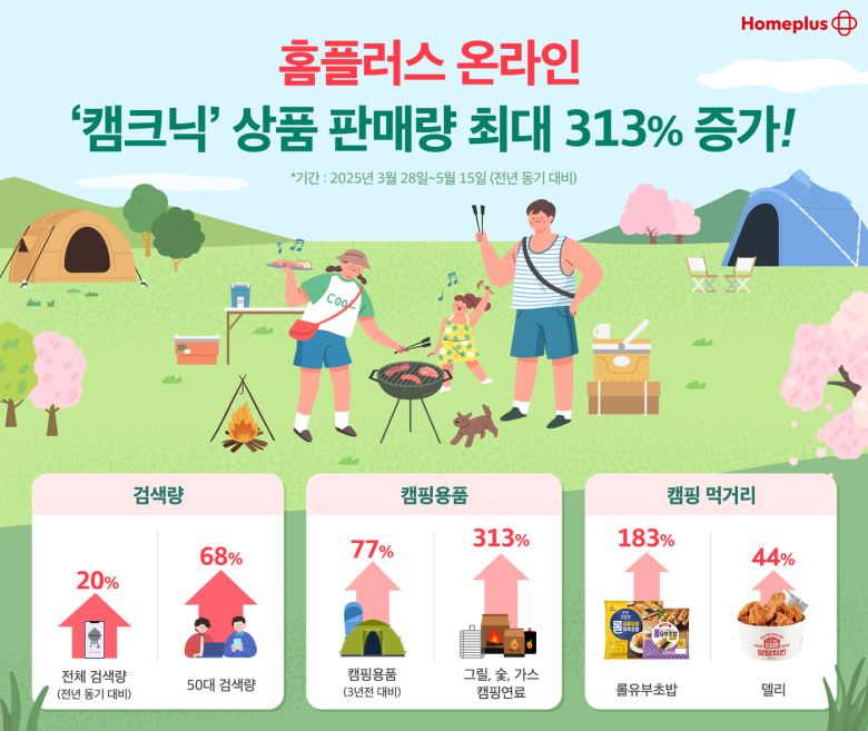 홈플러스에 따르면, 3월 28일부터 이달 15일까지 온라인몰 내 캠크닉 키워드 검색량은 전년 대비 20% 증가했다. 특히 50대 고객의 검색량은 68% 늘었다.