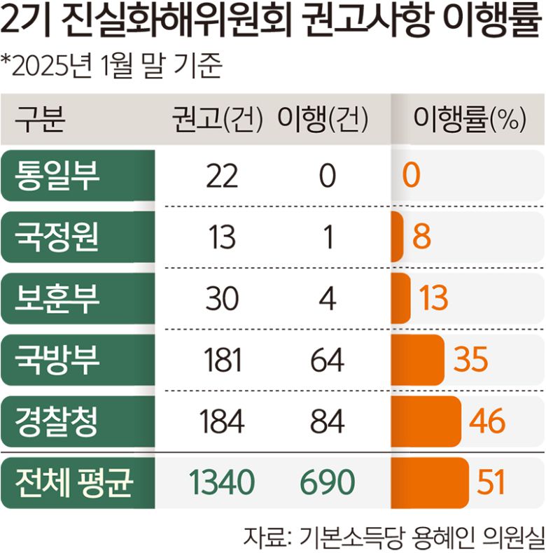진실규명 결정 이후 정부 기관들의 권고사항 이행률은 더욱 심각한 문제로 지적된다. 행정안전부에 따르면 올해 1월 말 기준 총 1340건의 권고사항 중 690건만 이행돼 이행률은 51%에 불과하다.