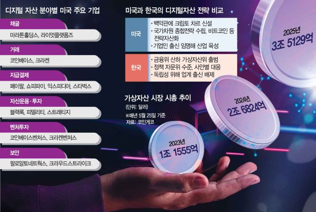 반면 국내 디지털자산 산업은 거래 위주로만 성장하면서 생태계 확장에는 지지부진한 상황이다. 아직 디지털자산 관련 법조차 제대로 마련되지 않아 규제 불확실성이 큰 상황인 만큼 기업 입장에서는 새로운 투자나 시도를 하기 어렵기 때문이다. 가상자산 업계의 한 관계자는 “미국에서는 거래소들까지 투자에 적극 뛰어들고 기술·네트워크·상장까지 지원하면서 선순환 구조를 만들어내고 있다”며 “이는 산업 전반의 자생력을 키우는 핵심 요소로 작용하고 있다”고 평가했다.