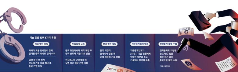 현지 법인 설립은 치밀해진 기술 유출범들의 수법을 보여주는 단적인 예다. 한국 지사를 세우면 제재를 피할 수 있고 외국 생활을 꺼리는 전문가들을 쉽게 영입할 수 있어 범죄에 유리하다는 게 검찰 설명이다. 해외에 법인을 세워 수사망을 피하거나 증거를 인멸하는 사례도 잇따랐다. 수원지검은 지난 1월 반도체 세정장비 기술 유출 사건을 수사해 2명을 구속 기소했다. 이들은 중국 반도체 업체와 기술이전 계약을 맺고 국내 기업의 전문인력을 중국 업체가 국내에 세운 법인으로 이직시키는 방식으로 기술을 빼돌리려 했다.