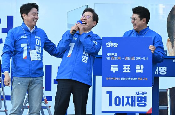 이재명 더불어민주당 대선후보가 25일 충남 아산시 탕정 한들물빛공원에서 열린 집중유세에서 사전선거 독려 퍼포먼스를 한 뒤 파안대소하고 있다.이 후보는 퍼포먼스 투표지가 투표함 아래 바닥에 떨어지자 '부정선거네요'하며 크게 웃었다. 김성룡 기자