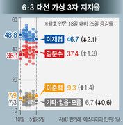한겨레와 여론조사 전문업체 에스티아이가 지난해 12월4일부터 지난 24일까지 중앙선거여론조사심의위원회에 등록된 188개 여론조사를 종합해 분석한 대선 지지율 예측조사에서 이재명 후보가 46.7%, 김문수 후보 37.4%, 이준석 후보가 9.3%를 기록했다. 일주일 전인 5월18일 예측치에 견줘 이재명 후보 지지율은 2.1%포인트 하락한 반면, 김문수 후보와 이준석 후보는 각각 1.3%포인트, 1.4%포인트가 올랐다.