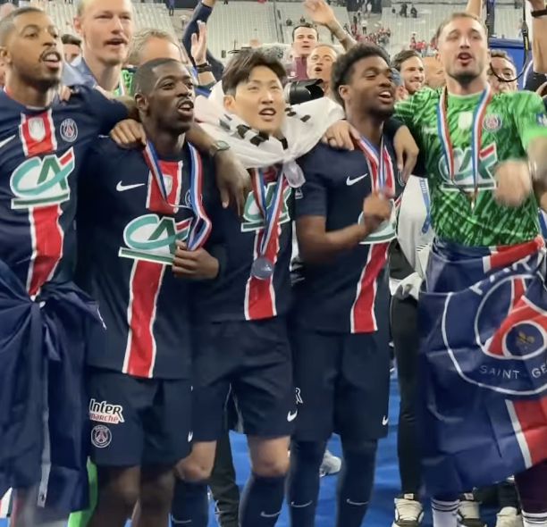 이강인도 태극기 허리춤에 둘렀다…우승 세리머니 → 0분 출전에도 프랑스컵 2연패 환호 → 통산 7번째 트로피