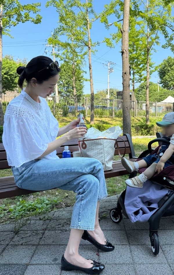 특히 시원한 자수 블라우스와 라이트 데님 팬츠, 블랙 플랫슈즈의 심플한 맘룩은 아이와의 움직임에도 불편함 없이 스타일을 살린 ‘현실맘 스타일링’의 정석이었다. 무심하게 묶은 포니테일에 선글라스를 머리에 얹은 룩은 꾸미지 않아도 빛나는 손연재의 분위기를 배가시켰다.