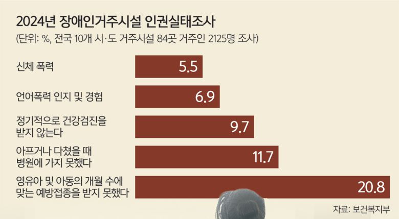 보건복지부의 ‘2024년 장애인거주시설 인권실태조사’에 따르면 거주인 중 언어폭력을 인지하거나 경험했다는 응답은 6.9%(1500명 중 103명), 신체 폭력은 5.5%(1507명 중 83명)에 달했다. 다만 이는 ‘응답 불가능’ 등을 포함한 것으로, ‘예’와 ‘아니요’로만 구분했을 경우 언어폭력은 11%, 신체 폭력도 8.7%로 집계됐다. 10개 시·도의 거주시설 84개소를 대상으로 지난해 3월부터 12월까지 진행된 조사에는 거주인 2125명, 직원 1768명이 응답했다.