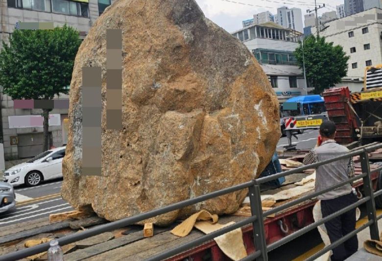 서울 신축 아파트 앞 거대 조경석이 옮겨지고 있다. /블라인드 |