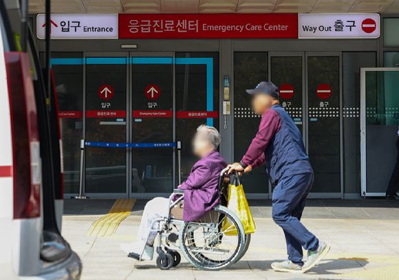 16일 서울 시내 한 대학병원에서 한 환자와 보호자가 응급실 앞을 지나고 있다. 2024.10.16 [사진=연합뉴스] |