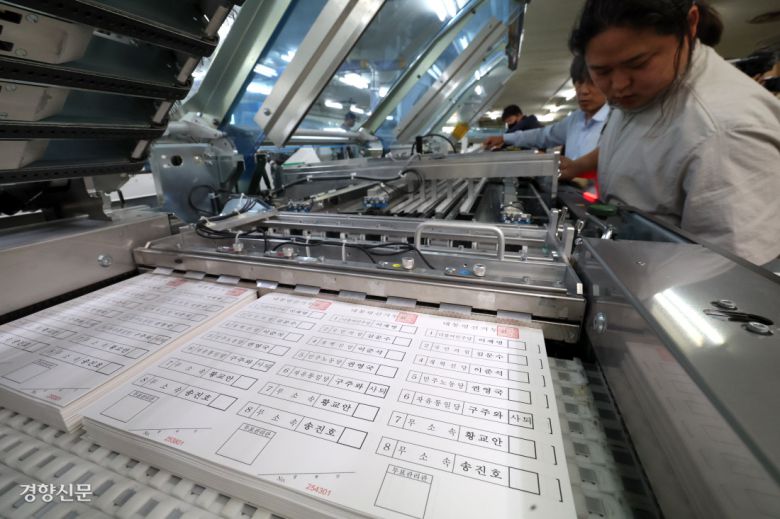 ‘선명한’ 이름 제21대 대통령 선거를 9일 앞둔 25일 경기 안양시 동안구 한 인쇄소에서 후보들의 이름이 적힌 투표용지가 인쇄되고 있다. 이준헌 기자 |