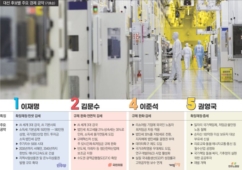 이재명 더불어민주당 후보는 재정을 풀어 신성장동력을 확보하는 확장적 재정 정책을 강조했다. 김문수 국민의힘 후보는 규제 철폐와 감세를 통한 경제성장에 방점을 찍었다. 이준석 개혁신당 후보는 ‘작은 정부’를, 권영국 민주노동당 후보는 ‘증세를 통한 불평등 해소’를 내걸었다.