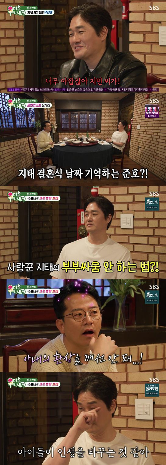김준호는 유지태에게 결혼 생활에 대한 조언을 구했다. 유지태는 아내 김효진과 잘 싸우지 않는다며 "아기들은 아빠가 슈퍼맨이라고 생각한다. 그래서 애들 체육대회 때 아빠들이 미친다. 절대 지면 안 된다. 그게 아이들이 바라보는 아빠다. 그런데 여성도 똑같다"고 말했다.