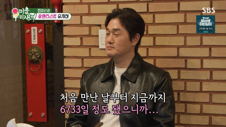 이날 코미디언 김준호는 절친 유지태에게 "너는 (결혼 생활) 행복하냐"고 물으며 "보통 10년 차 유부남들한테 물어보면 한숨부터 쉬는데"라고 덧붙였다. 그러자 유지태는 긍정을 보이며 "결혼 생활에 대한 로망이 있었거든"이라고 답했다. 이어 유지태는 "처음 만난 날부터 지금까지 6733일 정도 됐다"라고 말해 스튜디오를 술렁이게 했다. 패널들은 "저걸 다 세고 있네"라며 놀라워했다.