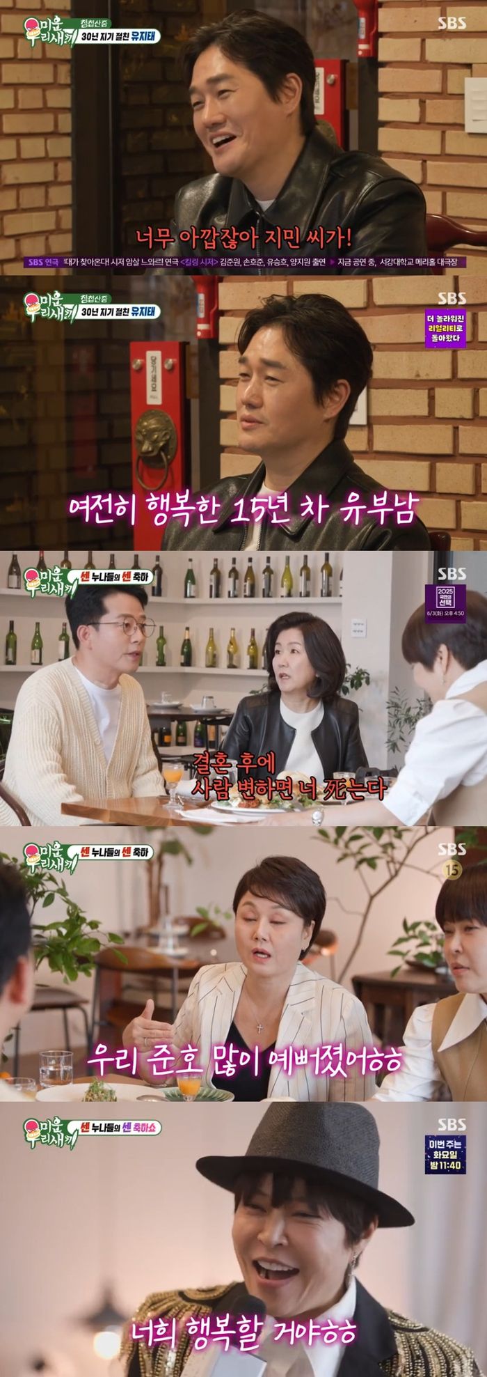 유지태는 아내랑 안 싸우는 방법이 있냐는 물음에 “우린 잘 안 싸워. 아기들은 아빠가 슈퍼맨이라고 생각해. 애들 체육대회 때 아빠들이 미쳐. 절대 지면 안 된다! 근데 여자도 똑같아. 처음에 사랑할 땐 멜로드라마 주인공 같은데 만나봤더니 아빠 같고 오빠 같잖아. 그걸 깨지 않게 계속 유지해야 해. 멋있는 척을 해야 해! 광활한 어깨로 다 받아주는 거야”라고 말해 김준호에게 깨달음을 줬다.