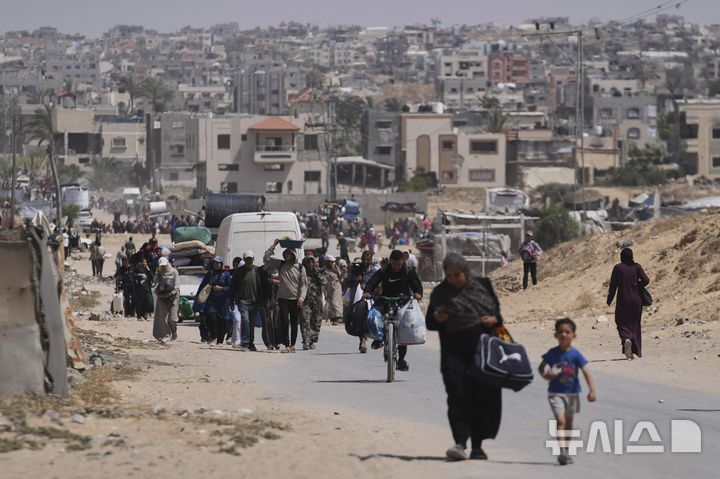 [칸유니스=AP/뉴시스] 19일(현지 시간) 가자지구 칸유니스에서 이스라엘군의 군사 작전이 계속되자, 팔레스타인 피란민들이 대피하고 있다. 이스라엘군은 칸유니스 지역 전체가 "위험한 전투 지역으로 간주될 것"이라며 칸유니스와 인근 마을 주민들에게 대피령을 내렸다. 2025.05.20.