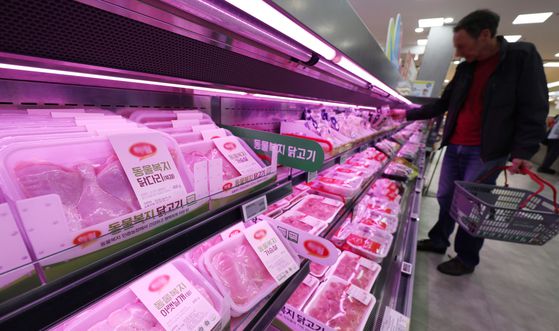 브라질산 닭고기 수입 중단이 이어지는 가운데 25일 서울 시내의 한 대형마트를 찾은 시민이 닭고기를 고르고 있다. [뉴시스]