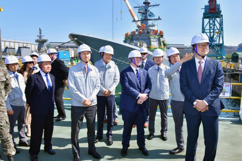 지난달 30일 HD현대중공업 울산 본사를 방문한 존 펠란 미국 해군성 장관이 정기선 회장과 조선소를 둘러보고 있다. /HD현대중공업