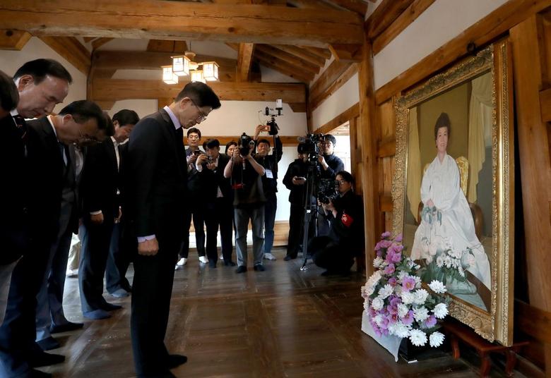 김문수 국민의힘 21대 대통령 선거 후보가 25일 충북 옥천 육영수 여사 생가를 찾아 묵념을 하고 있다.