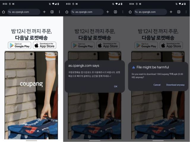 22일 안랩에 따르면 최근 쿠팡을 사칭한 스미싱 메시지가 불특정 다수를 상대로 발송되고 있다. 문자 내 URL을 클릭하면 정식 배송 조회 페이지와 유사한 페이지로 연결되고, 페이지 내에서 악성 앱을 설치하도록 유도하는 방식이다. 해당 악성 앱은 쿠팡이츠 아이콘까지 도용한 것으로 확인됐다.