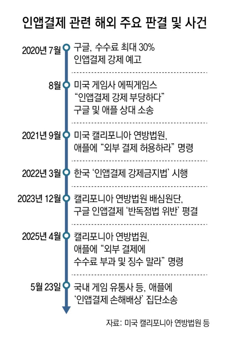 이번 소송 제기에는 미국 내에서의 판결도 영향을 미쳤다. 미국 법원은 2021년 애플에 “외부결제 링크를 허용하라”고 판단했으며, 지난달엔 “앱 외부 결제 등에 대해 수수료를 부과하거나 징수하지 말라”고 명령했다. 2023년 12월 구글에 대해서도 중국을 제외한 전 세계 시장에서 최대 30%의 인앱결제 수수료를 강제했던 것은 반독점법 위반이라는 판단이 나왔다. 재판 과정에서 실제 구글의 인앱결제 소요 비용은 4∼6%가량이라는 내부 문서가 공개되기도 했다.
