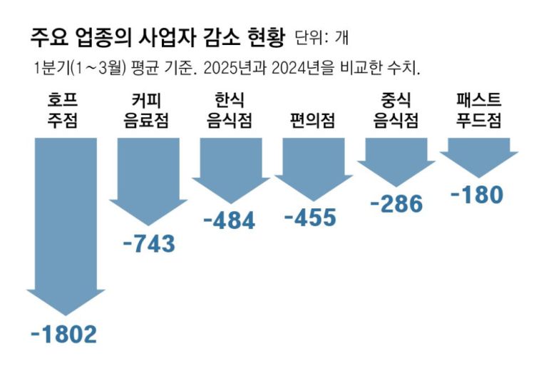 25일 국세청에 따르면 1분기 평균 커피음료점 수는 9만5337개로 1년 전 같은 기간보다 743개 줄었다. 편의점도 1년 새 455개 감소했고, 치킨·피자집이 포함되는 패스트푸드점도 180개 줄었다. 3개 업종의 가게 수가 전년보다 감소한 건 2018년 통계 개편 이후 처음이다. 한식음식점 수도 2024년 1분기보다 484개 줄었는데, 이 역시 2018년 이후 첫 감소세다. 이들 업종이 이미 포화 상태인 가운데 내수 부진 장기화, 원가 부담 상승 등이 겹치면서 가게 문을 닫는 자영업자가 늘어난 것으로 풀이된다.