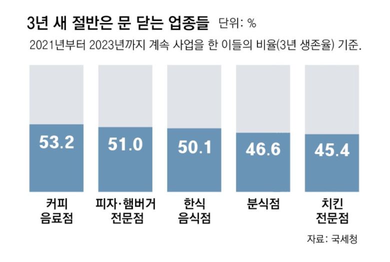시장 자체가 이미 포화 상태여서 내수 부진에 더욱 취약하다는 지적도 나온다. 국세청 분석에 따르면 치킨 전문점의 절반 이상은 2021년부터 2023년까지 3년도 버티지 못하고 폐업했다. 한식음식점(50.1%), 피자·햄버거 전문점(51.0%), 커피음료점(53.2%)도 3년간 사업을 지속한 비율이 절반 수준에 그쳤다.