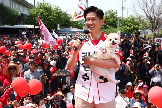 김문수 국민의힘 대선 후보가 25일 충남 보령군 대천역 광장에서 열린 집중유세에서 지지호소를 하고 있다. 뉴시스