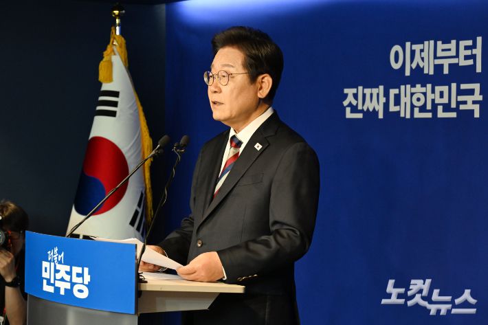 이재명 더불어민주당 대선 후보가 25일 오전 서울 여의도 중앙당사에서 기자간담회를 갖고 있다. 윤창원 기자