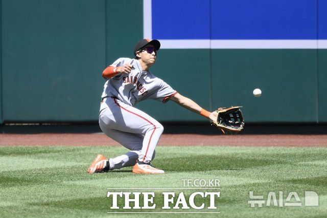 이정후가 26일(한국시간) 워싱턴전 2회말 수비에서 나다니엘 로우의 타구를 쫓아갔지만 아쉽게 잡아 내지 못했다. /워싱턴=AP.뉴시스