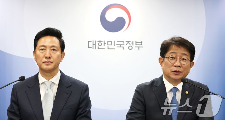 박상우 국토교통부 장관(오른쪽)과 오세훈 서울시장이 3월 19일 서울 종로구 정부서울청사에서 주택시장 안정화 방안 브리핑을 하고 있다. 2025.3.19/뉴스1 ⓒ News1 임세영 기자
