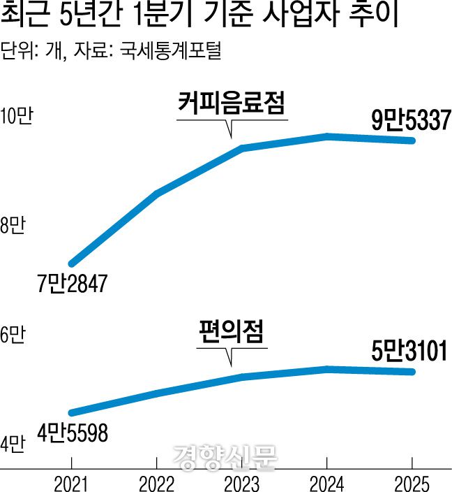 편의점과 요식업도 위축 흐름이 뚜렷하다. 올해 1분기 편의점 사업자는 5만3101개로 지난해 같은 기간보다 455개 감소했다. 이 또한 2018년 이후 처음으로 증가세가 꺾였다. 호프 주점 사업자는 2만2493개로 1년 새 1802개가 줄었고, 한식·중식 음식점도 각각 484개, 286개가 감소했다.