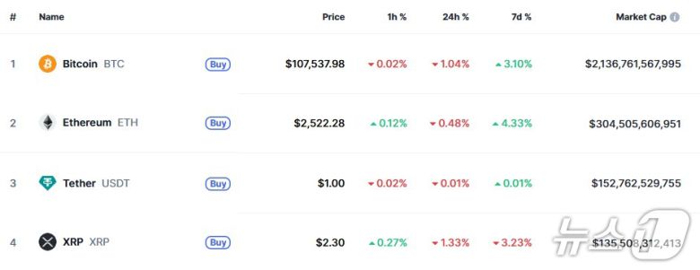 이 시각 현재 주요 암호화폐 시황-코인마켓캡 갈무리