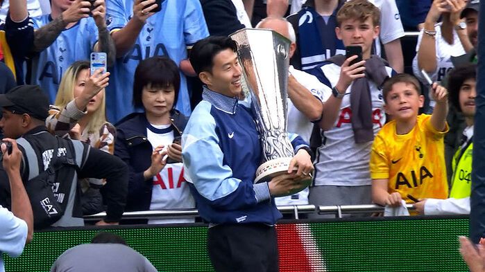 토트넘 손흥민 선수가 올 시즌 최종전을 보러온 홈 팬들 앞에서 유로파 우승 트로피를 다시 한 번 번쩍 들었습니다.
