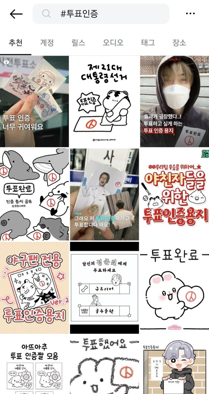 국내에서도 오는 29일부터 진행되는 사전투표와 6월 3일 본투표를 앞두고 ‘마음에 드는 게 너무 많아 어떤 걸 뽑아 갈지 고민 중’이라는 게시 글이 꾸준히 올라오고 있다. 서울 소재 사립대학에 재학 중인 대학생 최지민 씨(19)는 “작년 선거에서도 아이돌 그룹 ‘세븐틴’ 캐릭터 일러스트를 투표 인증 용지로 사용했다”며 “인스타그램 스토리에 올려 투표 인증을 하고, 좋아하는 아이돌 덕질도 할 수 있어 좋다”고 말했다.