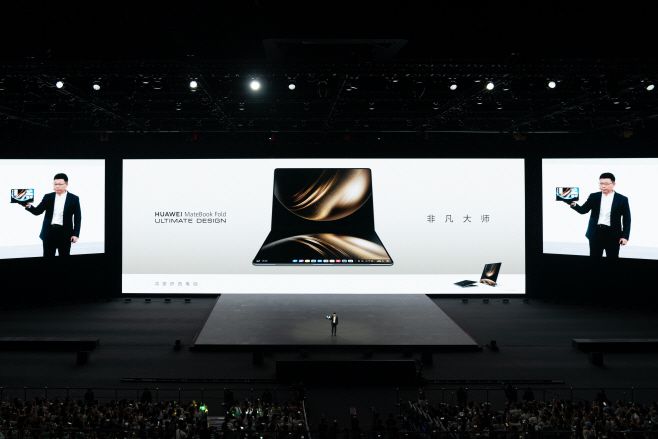 위청둥(余承東) 중국 화웨이(華爲) 소비자사업부문 최고경영자(CEO)가 19일 중국 쓰촨(四川)성 청두(成都)에서 진행된 메이트북 프로 및 메이트북 폴드 얼티미트(Ultimate) 디자인 출시 행사에서 메이트북 폴드 얼티미트 디자인을 소개하고 있다./신화·연합 |