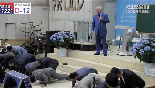 [서울=뉴시스] 지역 광역위원장들을 단상으로 불러내 엎드려뻗쳐를 시키는 전광훈 사랑제일교회 목사. (출처='전광훈TV') 2025.05.26. photo@newsis.com *재판매 및 DB 금지 |